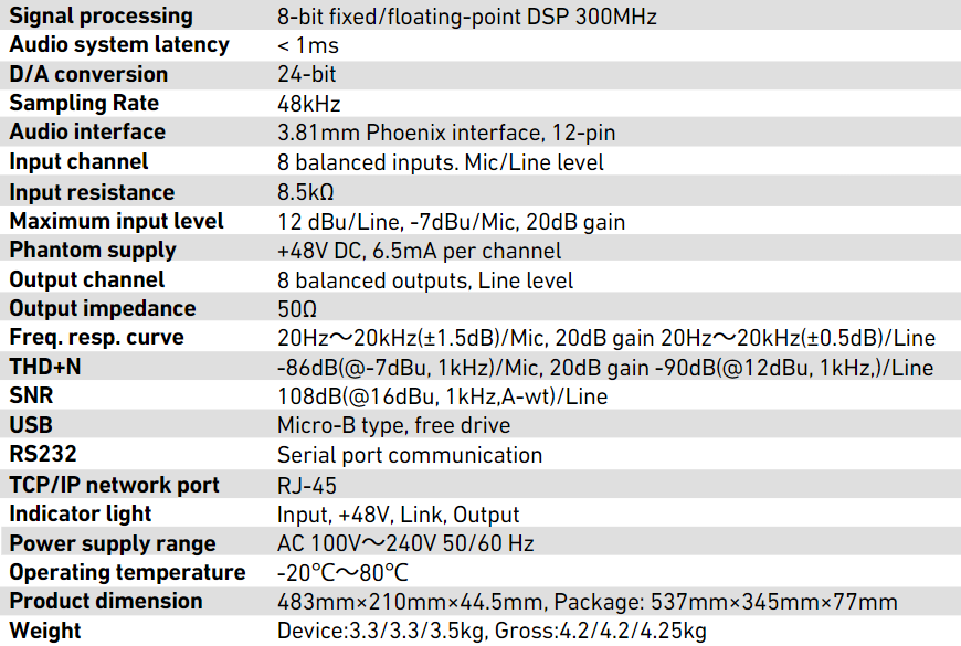 DM1616 models media matrix audio processors provide users with multiple channels for choosing: 16×16. Support analog input and analog output, input channels support mic level and line level. They can realize a variety of DSP functions, including matrix mixing, auto mixing, 64 x 64 channels can be expanded with additions. AFC(acoustic feedback control), AEC(acoustic echo control), ANC(acoustic noise control), echo and reverb effect, noise gate, delay, compressors, limiters, PEQ. The matrix can be quickly debugged and monitored through the nice GUI software Mconsole, which provides a broad operating space for the construction and operation of audio amplification systems. Suffix DM1616 D represents to configuring 8 channels of Dante network audio input and output. Each input supports ANC, Echo effects, Revert effects in local audio sound system.Each input supports AEC function in remote audio transmit system.Built-in USB sound card, good used in remote meeting, record and broadcast.Support auto mixing and matrix mixing of all channels.Nice GUI control software Mconsole (PC windows).USB free driver connecting. Support TCP/IP, USB wired control, Android App Tcon wireless control.Provide with RS232, RS485 central control and GPIO external control.Support camera tracking via most of camera control protocol.