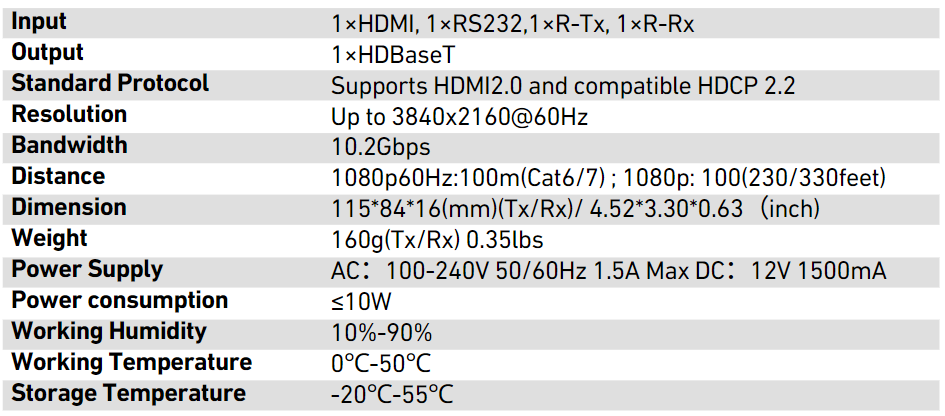 4K30 HDMI Extender HDBaseT transmitter and receiver is an extender with HDBaseT technology; The 4K30 HDMI Extender HDBaseT transmitter and receiver supports compression-, loss- and delay-free HDMI signal transmission. It can work with other HDBaseT equipment such as Sony HDBaseT projector. All signals are transmitted via a single CAT5E/ CAT6/ CAT7 cable, capable of transmitting up to 100 m(230/330ft) for 1080P, 70/100m (110/220ft) for 4K60Hz(4:2:0). Compatible with all HDTV resolutions, HDMI2.0 and HDCP 2.2 protocol. It also supports bidirectional RS232 and IR transmission and realizes long distance control. Supports power over cable (POC), users only need to power one side; Supports DTS-HD Master Audio transmission, Dolby TrueHD, Dolby Atmos, Dolby Digital Plus formats in audio format. 4K30 HDMI Extender HDBaseT transmitter and receiver is suitable for media conference room, school, meeting room, theater, cinema etc. It can be widely used in applications.