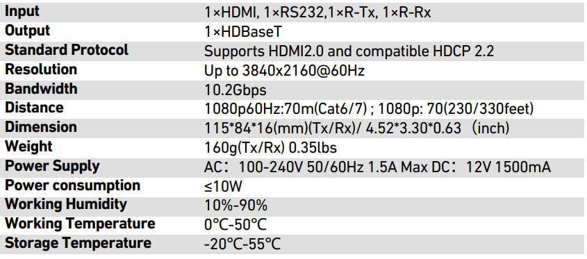 4K30 HDMI Extender HDBaseT transmitter and receiver is an HDBaseT technology extender, 4K30 HDMI Extender HDBaseT transmitter and receiver supports no compression, no losses, no latency HDMI signal transmission. It can can work with other HDBaseT equipment, such as Sony HDBaseT projector. All the signals are transmitted by one single CAT5E/ CAT6/ CAT7 cable, for 1080P it can transmit to a distance of 70m(230/330ft), for 4K60Hz( 4:2:0) , it can up to 35/70m(110/220ft). Compatible with all the HDTV resolutions, HDMI2.0 and HDCP 2.2 protocol. It also support bi-directional RS232 and IR transmission and realize the long distance control. Supports power over cable(POC), users only need to power one side; So 4K30 HDMI Extender HDBaseT transmitter and receiver can be popularly used in media conferencing room, school, government, cinema and so on applications.