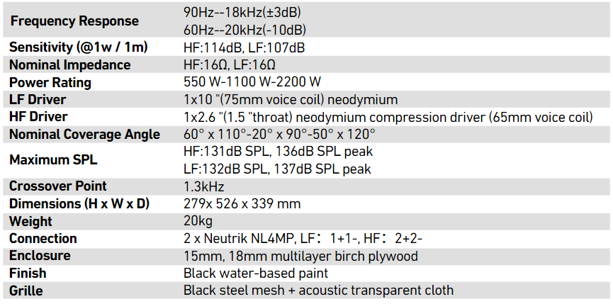The FLATLINE 10 is a single 10″ two way bi-amp passive line array speaker specially designed to small-medium live touring performance which needs crucial sound quality. FLATLINE 10 is a true line array speaker which designed by meeting all criteria of Wave front Sculpture Technology–A true line array should be guided strictly by physics principl. FLATLINE 10 utilizes a high quality neodymium 1.5″ horn throat compression tweeter with 65 mm (2.6″) voice coil and a 10” high output neodymium mid-low driver with 75mm voice coil and humidity resistant paper cone, coupled with an optimized waveguide (10° vertical and 90° horizontal dispersion, optional 60° vertical and 110° horizontal dispersion). FLATLINE 10 ensures extraordinary performance with penetration and smoothness. Ultra compact and solid enclosure made from 15mm or 18mm high quality plywood and finished with durable water paint for touring use.The 2 nylon strips offer protection to the bottom of the enclosure from scratches. Together with the slot which designed on the top of enclosure, the nylon strips also facilitate installation of one enclosure to another much easier. FLATLINE 10 can be either flown, ground stacked or pole-mounted on bass speakers (FLATLINE 18 DSP SUB) as main PA or ground stacked with subwoofer for front fill use.The integrated rigging system benefits from 3-point loading design. It’s precisely made and highly safe with durable magnetic PIN. The rigging system offers angle adjustment from 0 to 10° with 2° step.