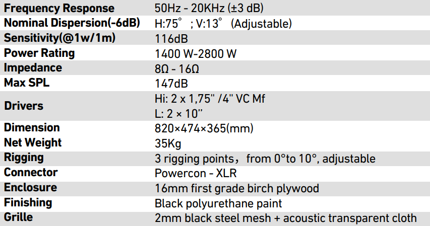 cutting-edge class-D big watts amplifier panels. The amplifiers modules all come with DSP that made-inUK,which enable users operate from distance on their PC. The finely designed,all aluminum hanging parts are 0-20 angle degree adjustable.The cabinet is constructed from