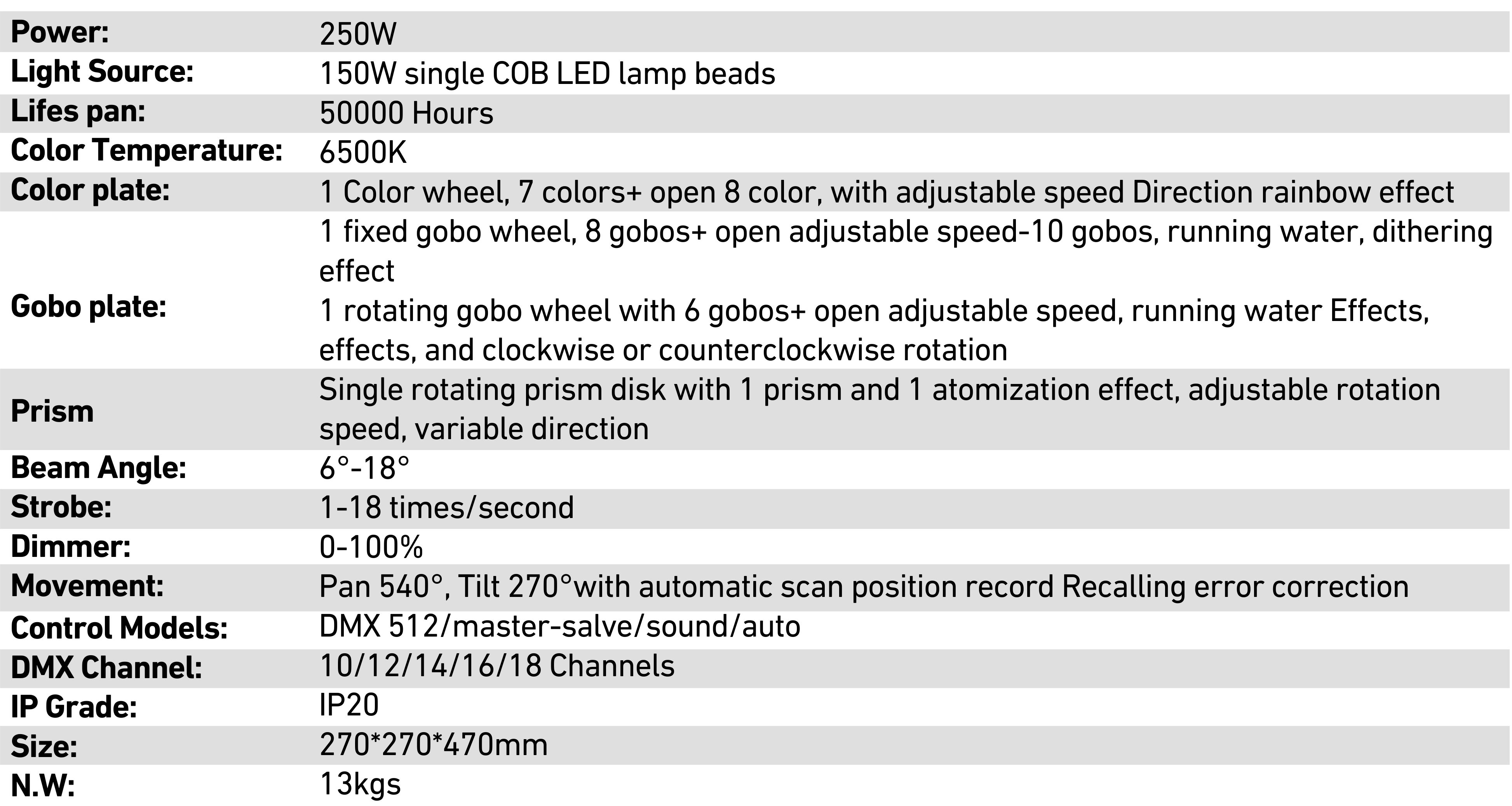 LBS150 is a compacted size moving head light with eco—friendly Led source. While small in stature, it delivers powerful light output with its 150-Watt white COB LED engine. With advanced optic system, it makes a perfect beam for any events. 2 gobo wheels 1 Static Gobo Wheel: 8 gobos +white-10 Gobos , wheel rotation and shake, 1 Rotation Gobo Wheel: 6 gobos +white-8 colors, wheel rotation and shake and one color wheel, 3-facet prism.
