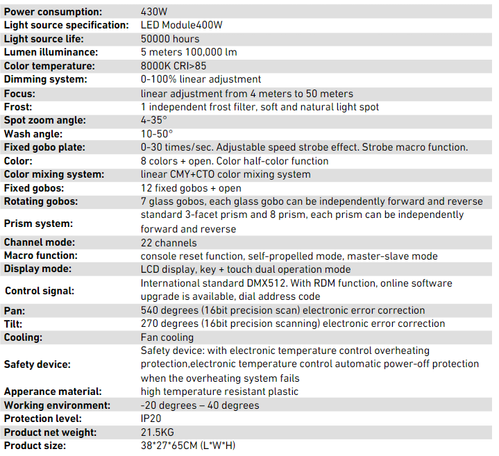 With its custom designed 400 Watt white LED engine, LM 400CMY is one of the most powerful LED hybrid moving heads on the market. The LED engine produces 100,000 lm @5meters, the beam is flat and uniform making projections crisp and colors rich. This fixture boasts a very comprehensive assortment of features: a 4°-35° zoom, CMY color mixing, an eight-colour wheel including a CRI enhancement filter, linear CTO, seven rotating gobos, twelve fixed gobos, two rotating prism 3facet and 8 linear, soft edge and flood frost filters, a 16-bit digital dimmer, and a fast digital stop-strobe effect. The LM 400CMY has low noise operating modes so you can use the unit virtually anywhere.