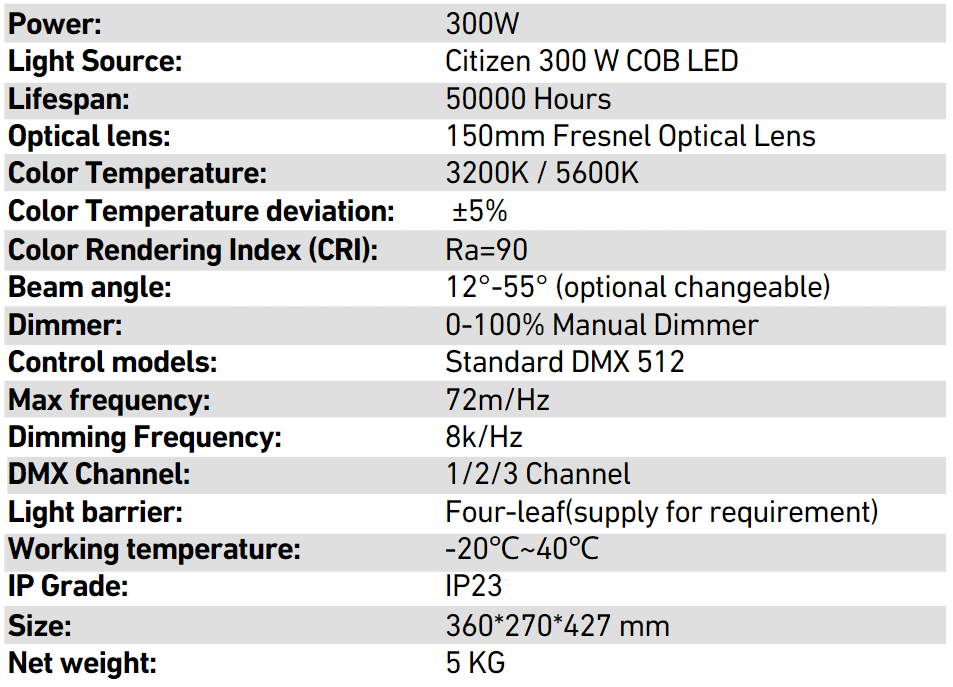LP 300 FR, 300W Led Fresnel Manual Zoom. with a high power 300W Cob Led Color temperature is 3200K or 5600K optional. Beam angle: 12°-55° Could be customized DMX512 zoom.
