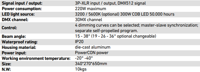 LP 300 PR 300 W zoom led profile, beam angle: 15 – 38°. Aluminum housing warm white or cold white is optional, with 16bit linear dimmer allowing the light to be turned on and off.