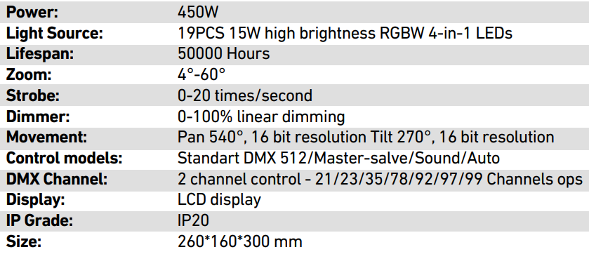 LWM1915 is a high performance wash moving head light with eco—friendly Led source. Zooming ranges from 4-60 degree, it provides sharp beam and pure wash function to the stage. With built-in macro function, it provides vivid effect to any performance.