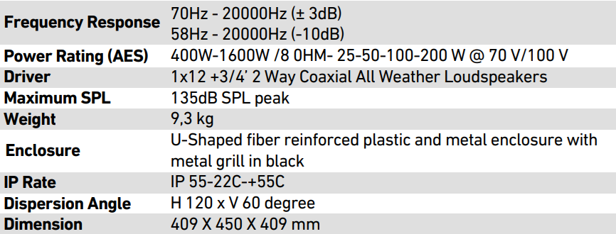 The OHS12W IT 10″ all-weather outdoor loudspeaker offers superior voice and music reproduction with a 120° x 60° coverage angle from a durable UV protected ABS construction. Outdoor level of IP55 rated for longlasting reliability in harsh environmental conditions, this 100V transformer built-in all weather outdoor loudspeaker incorporates a coaxial high-power 12″ woofer and 3/4″ tweeter that delivers full range frequency response up to 70-20KHz to meet all indoor and outdoor music applications. The all weather loudspeaker is perfect for background and foreground music, paging, and public address & voice evacuation in sports hall, football field, playground, park and outdoor live performance applications.