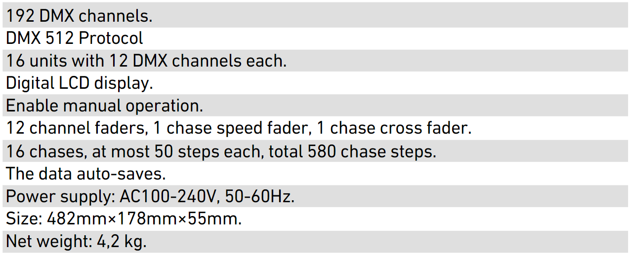 According to the universal DMX512 protocol, TRUCK S scanner controller can control sixteen 12-channel scanners or other equipment. Chase program and manual control of scanners can be performed at the same time. Its functions are compact. Its convenient and flexible operation made it be handled very easily. TRUCK S is suitable for different ballroom, taproom and small show.