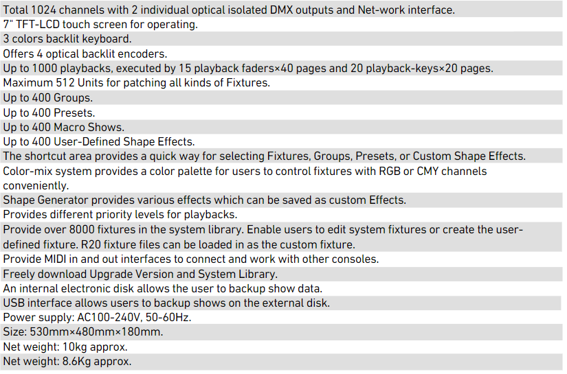 According to the universal DMX512 protocol, TRUCK XL scanner controller can control 1024-channel scanners or other equipment. Its convenient and flexible operation made it be handled very easily. 7″ TFT-LCD touch screen for operating.TRUCK XL is suitable for different ballroom,conference room,meeting, stadium,theatre, taproom and big show.